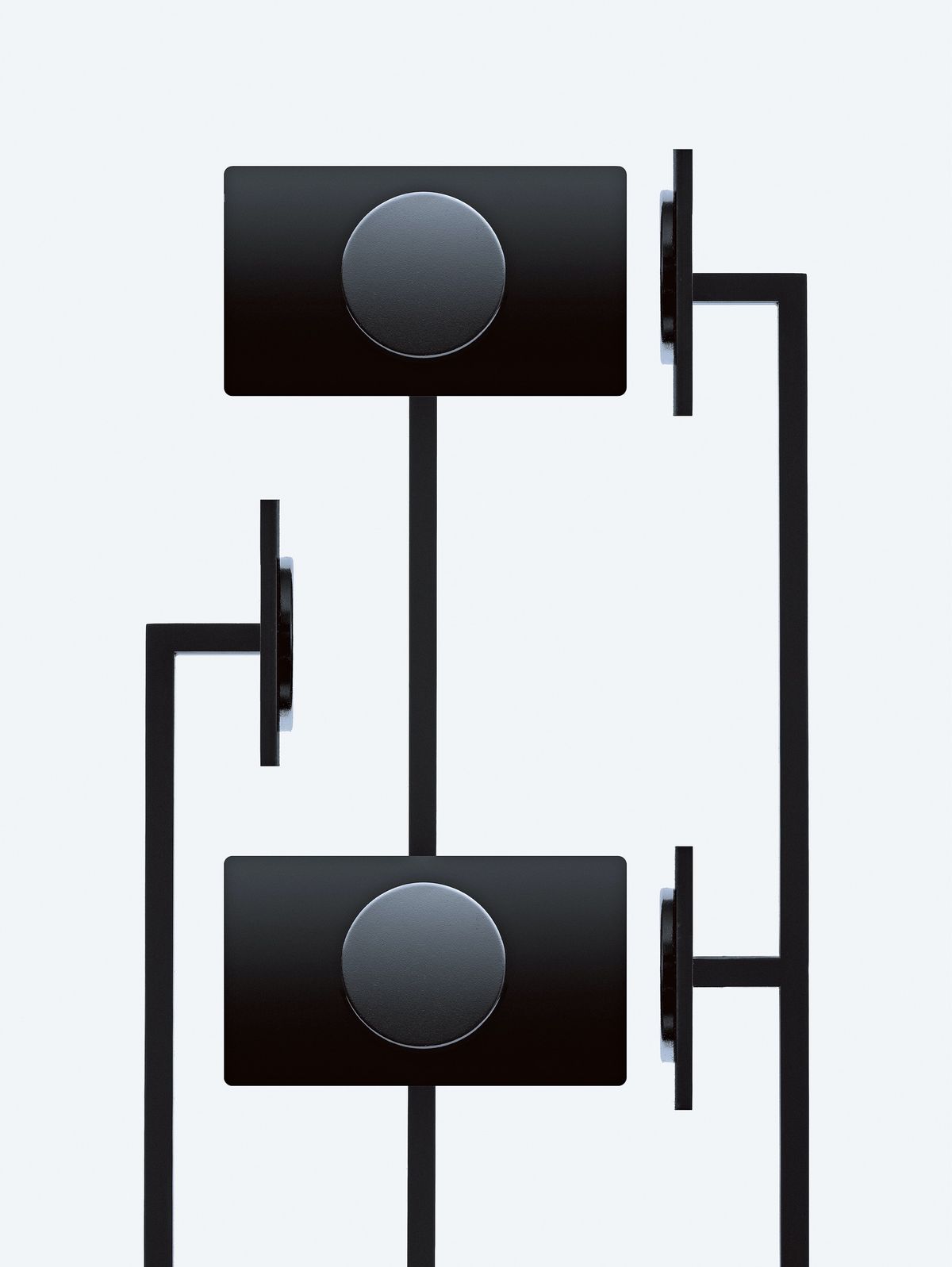 A simple flat base and minimal square section stem carries wallets with elegant simplicity